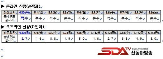 Ãʱâ È¥Àâ°ú ½Ã½ºÅÛ °úºÎÇÏ ¹æÁö¸¦ À§ÇØ ½ÃÇà ù 2ÁÖ°£ ¿Â¶óÀÎÀº ¡®Ãâ»ý¿¬µµ ³¡ÀÚ¸® ±âÁØ È¦Â¦Á¦¡¯, ¹æ¹® ½ÅûÀº ¡®¿äÀÏÁ¦¡¯¸¦ ¿î¿ëÇÑ´Ù. ÀÌ¿¡ µû¶ó 4¿ù 30ÀÏÀº ¹æ¹® ½ÅûÀÇ °æ¿ì Ãâ»ý¿¬µµ ³¡ÀÚ¸® 2¡¤7¹øÀÌ 5¿ù 4ÀÏ(¿ù)Àº 1¡¤6¹øÀÌ ½ÅûÇÒ ¼ö ÀÖ´Ù. ´Ü, ¿äÀÏÁ¦´Â ½Ã±º ¿©°Ç¿¡ µû¶ó ´ÜÃà ¶Ç´Â ¿¬ÀåµÉ ¼ö ÀÖ´Ù.