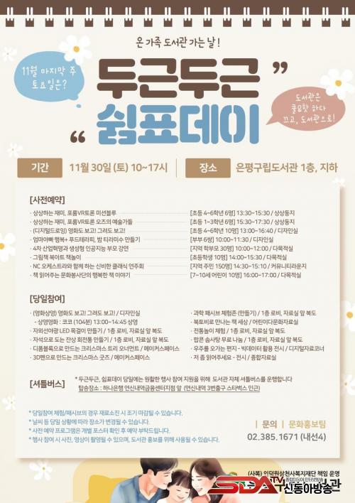 ¡¯µÎ±ÙµÎ±Ù, ½°Ç¥µ¥ÀÌ!¡®´Â ¿Â °¡Á·ÀÌ ÇÔ²² µµ¼°ü¿¡ °¡´Â ³¯À̶ó´Â »çȸÀû ºÐÀ§±â Á¶¼ºÀ» À§ÇÑ ÀºÆò±¸¸³µµ¼°ü¸¸ÀÇ Æ¯º°ÇÑ ¹®È°¡ ÀÖ´Â ³¯ÀÌ´Ù. Ȧ¼ö´Þ ¸¶Áö¸· ÁÖ Åä¿äÀÏ¿¡ ÁøÇàµÇ¸ç, µµ¼°ü¿¡ ¹æ¹®ÇÏ´Â ÀÌ¿ëÀÚµéÀ» À§ÇÑ ´Ù¾çÇÑ ÇÁ·Î±×·¥À» ¼±º¸ÀδÙ.