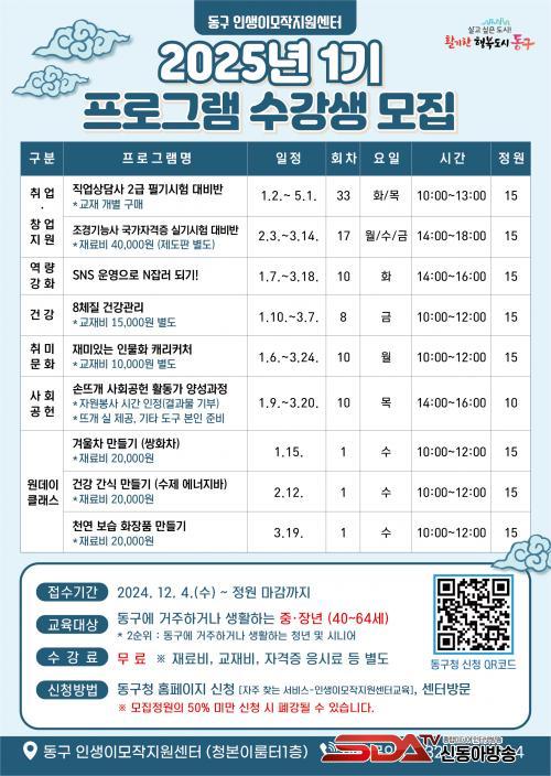 º» ÇÁ·Î±×·¥Àº 2025³â 1¿ùºÎÅÍ 3¿ù±îÁö ÁøÇàµÇ¸ç, ÁßÀå³âÃþÀÇ Ã롤â¾÷ Áö¿ø, ¿ª·® °È, °Ç° ¹× Ãë¹Ì ¹®È, »çȸ°øÇåȰµ¿ µîÀ» À§ÇÑ ÃÑ 9°³ °úÁ¤À¸·Î ¿î¿µÇÑ´Ù.