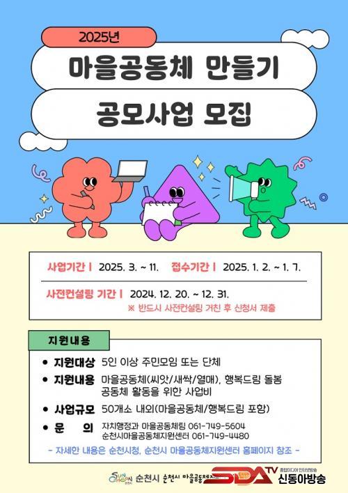 °ø¸ð»ç¾÷ ½ÅûÀº ¼øÃµ½Ã ¸¶À»°øµ¿Ã¼Áö¿ø¼¾ÅÍ »çÀüÄÁ¼³ÆÃÀ» °ÅÄ£ ÈÄ ½ÅûÇÒ ¼ö ÀÖÀ¸¸ç, ±âŸ ÀÚ¼¼ÇÑ »çÇ×Àº ¼øÃµ½Ãû ´©¸®Áý ¶Ç´Â ¼øÃµ½Ã¸¶À»°øµ¿Ã¼Áö¿ø¼¾ÅÍ(061-749-4480)·Î ¹®ÀÇÇÏ¸é µÈ´Ù.