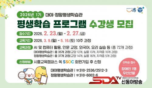 [½Åµ¿¾Æ¹æ¼Û ½ÃÈï½Ã=À̽ŵ¿±âÀÚ] ½ÃÈï½Ã ´ë¾ß¤ýÁ¤¿ÕÆò»ýÇнÀ°üÀº ¿À´Â 2¿ù 23ÀϺÎÅÍ 27ÀϱîÁö ¡®2026³â 1±â Æò»ýÇнÀ ÇÁ·Î±×·¥¡¯ ¼ö°­»ýÀ» ¸ðÁýÇÑ´Ù. À̹ø 1±â ÇÁ·Î±×·¥Àº 3¿ù 9ÀϺÎÅÍ 5¿ù 16ÀϱîÁö 10ÁÖ°£ ¿î¿µµÈ´Ù.