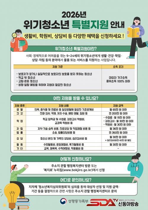 À§±âû¼Ò³â Ưº°Áö¿øÀº »çȸ¡¤°æÁ¦ÀûÀ¸·Î ¾î·Á¿òÀ» °Þ°í ÀÖ´Â À§±âû¼Ò³âÀ» Àû±ØÀûÀ¸·Î ¹ß±¼ÇØ »ýȰ¡¤°Ç°¡¤Çо÷¡¤»ó´ã¡¤ÀÚ¸³¡¤¹ý·ü¡¤È°µ¿ µî ´Ù¾çÇÑ ºÐ¾ßÀÇ º¹Áö ¼ºñ½º¸¦ Á÷Á¢ Áö¿øÇÏ´Â »ç¾÷ÀÌ´Ù.