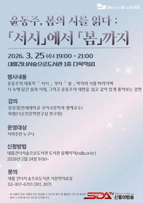 [½Åµ¿¾Æ¹æ¼Û ÀºÆò±¸=À̽ŵ¿±âÀÚ] ¼­¿ï ÀºÆò±¸´Â ´ÙÀ½ ´Þ 25ÀÏ, ³»¸¦ °Ç³Ê¼­ ½£À¸·Î µµ¼­°ü¿¡¼­ ¡®À±µ¿ÁÖ, º½ÀÇ ½Ã¸¦ Àд٠– ¡º¼­½Ã¡»¿¡¼­ ¡ºº½¡»±îÁö¡¯ °­¿¬À» °³ÃÖÇÑ´Ù°í ¹àÇû´Ù.