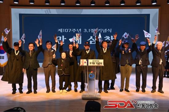 1ÀÏ ½Ãû º°°ü ´ë°­´ç¿¡¼­ °³ÃÖµÈ Á¦107ÁÖ³â 3.1Àý ±â³ä½Ä¿¡¼­ ÀÌÇöÀç Çϳ²½ÃÀåÀ» ºñ·ÔÇÏ¿© Çϳ²½Ã µ¶¸³¿îµ¿°¡ ÈÄ¼Õ ¹× ±¤º¹È¸¿øµéÀÌ ¸¸¼¼»ïâÀ» ¿ÜÄ¡°í ÀÖ´Ù.