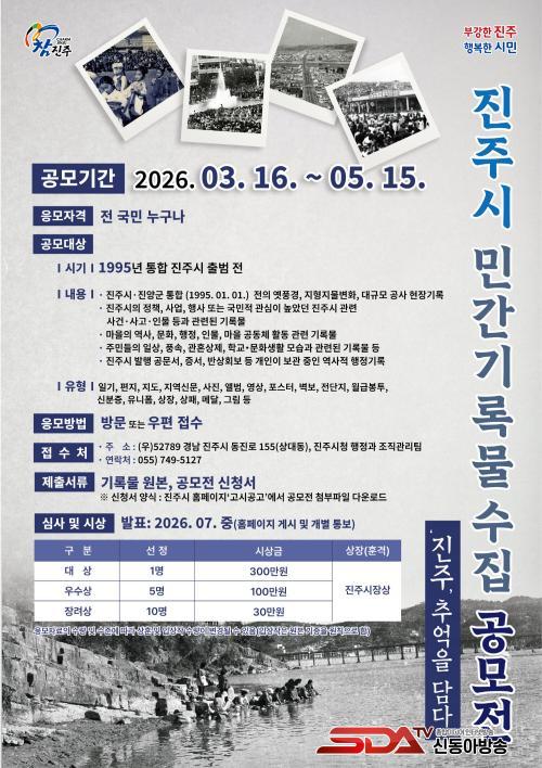 Á¢¼öµÈ ±â·Ï¹°Àº ½É»ç¸¦ °ÅÃÄ ´ë»ó 1¸í(300¸¸ ¿ø), ¿ì¼ö»ó 5¸í(°¢ 100¸¸ ¿ø), Àå·Á»ó 10¸í(°¢ 30¸¸ ¿ø)À» ¼±Á¤ÇØ ½Ã»óÇÒ ¿¹Á¤À̸ç, °á°ú´Â 7¿ù Áß¿¡ ÁøÁÖ½Ãû ´©¸®Áý ¿¡ °Ô½Ã ¹× °³º° Å뺸ÇÑ´Ù.