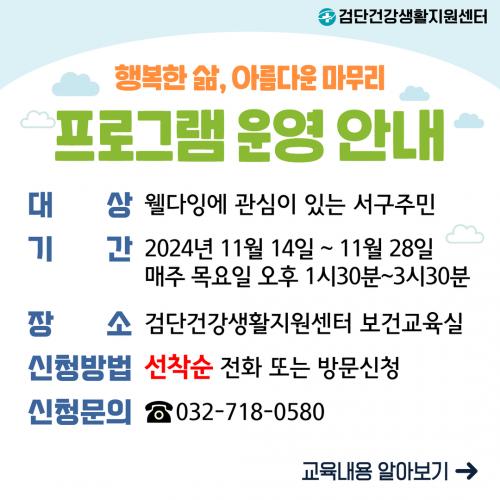 [½Åµ¿¾Æ¹æ¼Û ÀÎõ= À±¹Î½Ä±âÀÚ] ÀÎõ ¼­±¸(±¸Ã»Àå °­¹ü¼®) °Ë´Ü°Ç°­»ýȰÁö¿ø¼¾ÅÍ¿¡¼­´Â ÀλýÀÇ ¸¶Áö¸· ¼ø°£À» ¾Æ¸§´ä°Ô ¸¶¹«¸®Çϱâ À§ÇÑ Áغñ ÇÁ·Î±×·¥ÀÎ À£´ÙÀ×(Well- Dying) ±³À°À» ¿î¿µÇÒ ¿¹Á¤ÀÌ´Ù. Ãʰí·É»çȸ·Î ÁøÀÔÀ» ¾ÕµÎ°í ¾î¸£½ÅµéÀÌ Á¸¾öÇÏ°Ô »ýÀ» ¸¶¡¦
