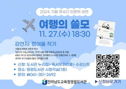 [½Åµ¿¾Æ¹æ¼Û ¿µ±¤±º=À̽ŵ¿±âÀÚ] Àü¶ó³²µµ±³À°Ã»¿µ±¤µµ¼­°üÀº 11¿ù 27ÀÏ ¼ö¿äÀÏ Àú³á 6½Ã 30ºÐ Áö¿ª¹ÎÀ» ´ë»óÀ¸·Î <娼ö´Ù Àι®ÇÐ>À» ¿î¿µÇÑ´Ù. °­¿¬ÀÚÀÎ Á¤¿©¿ï ÀÛ°¡´Â ¡º°¨¼ö¼º ¼ö¾÷¡», ¡º¿ÀÁ÷ ³ª¸¦ À§ÇÑ ¹Ì¼ú°ü¡», ¡º³¡±îÁö ¾²´Â ¿ë±â¡», ¡º³ª¸¦ µ¹º¸Áö ¾Ê´Â ³ª¿¡¡¦