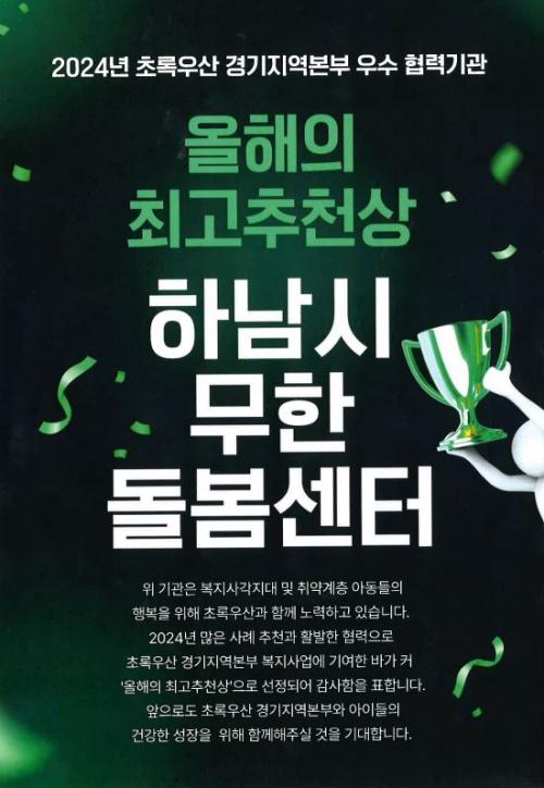[½Åµ¿¾Æ¹æ¼Û Çϳ²½Ã=À̽ŵ¿±âÀÚ] Çϳ²½Ã´Â ÃÊ·Ï¿ì»ê ¾î¸°ÀÌÀç´Ü °æ±âÁö¿ªº»ºÎ¿¡¼­ ¼±Á¤ÇÏ´Â ¡®¿ì¼ö Çù·Â±â°ü ¹× ¿ÃÇØÀÇ ÃÖ°í Ãßõ»ó¡¯¿¡ ¼±Á¤µÆ´Ù°í ¹àÇû´Ù. ÃÊ·Ï¿ì»ê ¾î¸°ÀÌÀç´Ü °æ±âÁö¿ªº»ºÎ´Â À§±â¾Æµ¿À» Áö¿øÇÏ´Â Àç´ÜÀ¸·Î, 135°³ ±â°ü(16°³ ÁöÀÚü ¹× À¯°ü±â°ü ¡¦