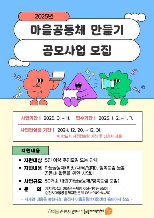 [½Åµ¿¾Æ¹æ¼Û ¼øÃµ=±è¿ëÈÆ ±âÀÚ] ¼øÃµ½Ã(½ÃÀå ³ë°ü±Ô)´Â 2025³â ¸¶À»°øµ¿Ã¼ ¸¸µé±â °ø¸ð»ç¾÷¿¡ Âü¿©ÇÒ °øµ¿Ã¼¸¦ ³»³â 1¿ù 7ÀϱîÁö ¸ðÁýÇÑ´Ù. ¸ðÁýºÐ¾ß´Â ÁÖ¹ÎÁÖµµ ¸¶À»°øµ¿Ã¼ Ȱ¼ºÈ­¸¦ À§ÇØ °ø¸ð»ç¾÷¿¡ Âü¿©ÇÒ ¡®Çູµå¸² µ¹º½°øµ¿Ã¼¡¯¿Í ¡®¸¶À»°øµ¿Ã¼ Ȱµ¿Áö¿ø(°ø±â¡¦