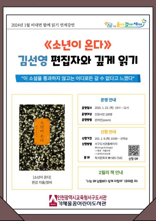 [½Åµ¿¾Æ¹æ¼Û ÀÎõ= À±¹Î½Ä±âÀÚ] ÀÎõ±¤¿ª½Ã±³À°Ã»¼­±¸µµ¼­°ü(°üÀå Á¤¿¬¼ø)Àº 1¿ù 23ÀÏ ¿ÀÈÄ 7½Ã, 1¿ù ¡®ºñ´ë¸é ÇÔ²² Àб⡯ ¿¬°è ÇÁ·Î±×·¥À¸·Î ±è¼±¿µ ÆíÁýÀÚ¸¦ ÃÊûÇÏ¿© ¡®¼Ò³âÀÇ ¿Â´Ù¡¯±í°Ô Àб⠰­¿¬À» ºñ´ë¸é(ZOOM)À¸·Î ¿î¿µÇÑ´Ù. ±è¼±¿µ ÆíÁýÀÚ´Â ¡®¼Ò³âÀÌ ¿Â´Ù¡¦