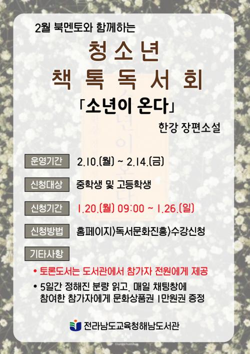 [½Åµ¿¾Æ¹æ¼Û Àü³²Çس²=À̽ŵ¿±âÀÚ] Àü¶ó³²µµ±³À°Ã»Çس²µµ¼­°üÀº 2.10.(¿ù)ºÎÅÍ 2.14.(±Ý)±îÁö ºñ´ë¸é µ¶¼­¸ðÀÓÀÎ ¡®ºÏ¸àÅä¿Í ÇÔ²²Çϴ û¼Ò³â Ã¥Ååµ¶¼­È¸¡¯¸¦ ¿î¿µÇÑ´Ù. û¼Ò³â Ã¥Ååµ¶¼­È¸´Â Áß¡¤°íµîÇлýµéÀ» ´ë»óÀ¸·Î ¿î¿µµÇ¸ç, ÇѰ­ ÀÛ°¡ÀÇ ³ëº§¹®ÇлóÀ» ±â³äÇÏ¡¦