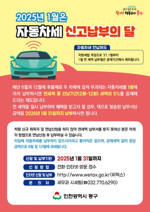 ÀÎõ µ¿±¸, 2025³â ÀÚµ¿Â÷¼¼ ¿¬³³ ¹× ÀϽà ³³ºÎ ½Åû ¹Þ¾Æ