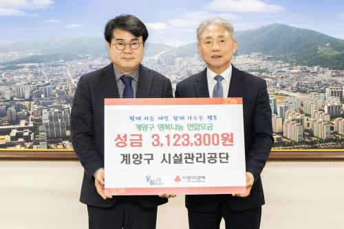 [½Åµ¿¾Æ¹æ¼Û = À±¹Î½Ä±âÀÚ] ÀÎõ±¤¿ª½Ã °è¾ç±¸(±¸Ã»Àå À±È¯)´Â Áö³­ 16ÀÏ °è¾ç±¸½Ã¼³°ü¸®°ø´Ü(ÀÌ»çÀå ¹Ú¼º¹Î) Á÷¿øµéÀÌ ¼³ ¸íÀýÀ» ¸Â¾Æ Ãë¾à°èÃþ Áö¿øÀ» À§ÇÑ ÀÌ¿ô µ½±â ¼º±Ý 3,123,300¿øÀ» ±âŹÇß´Ù°í ¹àÇû´Ù. °è¾ç±¸½Ã¼³°ü¸®°ø´ÜÀº °è¾ç±¸ °ø°ø½Ã¼³¹°ÀÇ È¿À²ÀûÀΡ¦