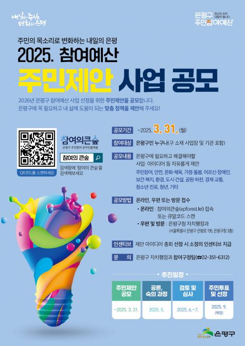 [½Åµ¿¾Æ¹æ¼Û ÀºÆò±¸=À̽ŵ¿±âÀÚ] ÀºÆò±¸´Â ¿À´Â 3¿ù 31ÀϱîÁö ¡®Âü¿©¿¹»ê ÁÖ¹ÎÁ¦¾È »ç¾÷°ø¸ð¡¯¸¦ ÁøÇàÇÑ´Ù°í ¹àÇû´Ù. ¿ÃÇØ Âü¿©¿¹»ê Àüü ±Ô¸ð´Â ÀϹÝ, û³â, û¼Ò³â, µ¿ Áö¿ª»ç¾÷ ºÐ¾ß µîÀ» Æ÷ÇÔÇØ ÃÑ 30¾ï ¿øÀÌ´Ù. ÀºÆò±¸¹ÎÀ̶ó¸é ´©±¸³ª »ýȰ ¼Ó ºÒÆí »çÇ×À» ÇØ°á¡¦