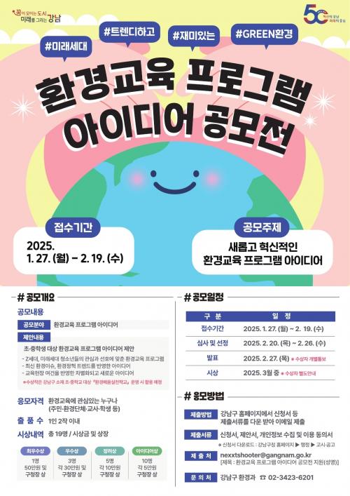 [½Åµ¿¾Æ¹æ¼Û °­³²±¸=À̽ŵ¿±âÀÚ] ²ÞÀÌ ¸ðÀÌ´Â µµ½Ã, ¹Ì·¡¸¦ ±×¸®´Â °­³²±¸°¡ âÀÇÀûÀÌ°í ½ÇÈ¿¼º ³ôÀº ȯ°æ±³À° ÄÜÅÙÃ÷¸¦ ¹ß±¼Çϱâ À§ÇØ ¡®2025³â ȯ°æ±³À° ÇÁ·Î±×·¥ °ø¸ðÀü¡¯À» 1¿ù 27ÀϺÎÅÍ 2¿ù 19ÀϱîÁö ÁøÇàÇÑ´Ù. ¿ÃÇØ·Î 3ȸ°¸¦ ¸Â´Â À̹ø °ø¸ðÀüÀº ¡®»õ·Ó°í Çõ½Å¡¦