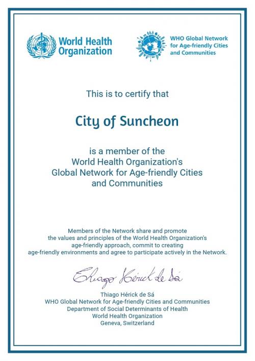 [½Åµ¿¾Æ¹æ¼Û ¼øÃµ=±è¿ëÈÆ ±âÀÚ] ¼øÃµ½Ã(½ÃÀå ³ë°ü±Ô)´Â ¼¼°èº¸°Ç±â±¸(WHO)·ÎºÎÅÍ °í·Éģȭµµ½Ã ±¹Á¦³×Æ®¿öÅ© ÀçÀÎÁõÀ» ¹Þ¾Æ 2029³â±îÁö ÀÚ°ÝÀ» À¯ÁöÇÑ´Ù°í 10ÀÏ ¹àÇû´Ù. °í·Éģȭµµ½Ã ±¹Á¦³×Æ®¿öÅ©´Â °í·ÉÈ­¿¡ È¿°úÀûÀ¸·Î ´ëÀÀÇϱâ À§ÇØ ¼¼°èº¸°Ç±â±¸°¡ 2006³âºÎÅÍ¡¦