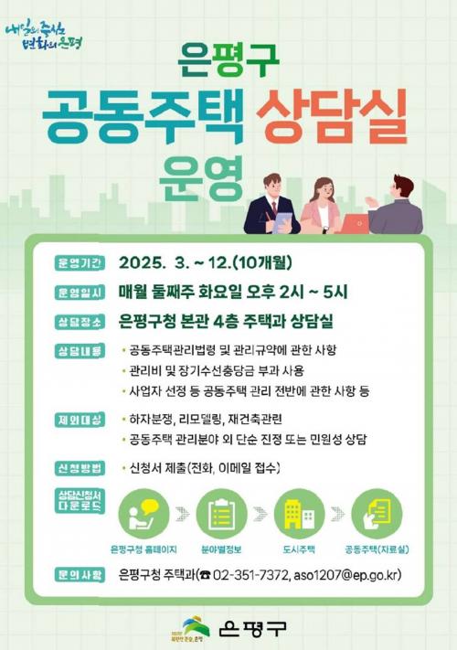 [½Åµ¿¾Æ¹æ¼Û ÀºÆò±¸=À̽ŵ¿±âÀÚ] ÀºÆò±¸´Â °øµ¿ÁÖÅà ÀÔÁֹεéÀÇ ±ÇÀÍ º¸È£¿Í ºÐÀï ¿¹¹æÀ» À§ÇØ ÀÌ´ÞºÎÅÍ ¡®°øµ¿ÁÖÅà »ó´ã½Ç¡¯À» ¿î¿µÇÑ´Ù°í ¹àÇû´Ù. ¡®°øµ¿ÁÖÅà »ó´ã½Ç¡¯Àº °øµ¿ÁÖÅðú ÁýÇհǹ° °ü·Ã Á¤º¸°¡ ºÎÁ·ÇÑ ÀÔÁֹε鿡°Ô Àü¹® »ó´ã ¼­ºñ½º¸¦ Á¦°øÇÑ´Ù. °øµ¿»ý¡¦