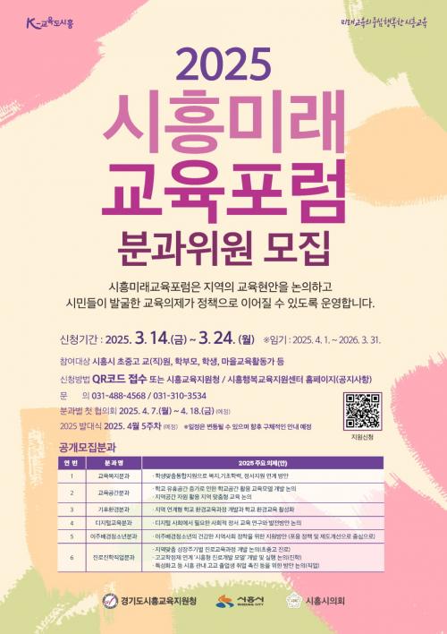 [½Åµ¿¾Æ¹æ¼Û ½ÃÈï½Ã=À̽ŵ¿±âÀÚ] ½ÃÈï½Ã´Â 3¿ù 14ÀϺÎÅÍ 24ÀϱîÁö ¡®2025 ½ÃÈï¹Ì·¡±³À°Æ÷·³¡¯ÀÇ ºÐ°úÀ§¿øÀ» °ø°³ ¸ðÁýÇÑ´Ù. ½ÃÈï¹Ì·¡±³À°Æ÷·³Àº ½ÃÈï½Ã¿Í °æ±âµµ½ÃÈï±³À°Áö¿øÃ», ½ÃÈï½ÃÀÇȸ°¡ ½ÃÈïÁö¿ª ±³À°°øµ¿Ã¼ °£ ¼ÒÅë°ú Çù¾÷À» ÅëÇØ ±³À°ÀÇÁ¦¸¦ ¹ß±¼Çϰí À̸¦ Á¤Ã¥¡¦
