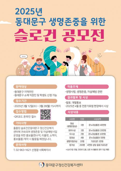 [½Åµ¿¾Æ¹æ¼Û µ¿´ë¹®±¸=À̽ŵ¿±âÀÚ] ¼­¿ï µ¿´ë¹®±¸´Â ÀÚ»ì ¿¹¹æÀÇ Á߿伺À» ¾Ë¸®°í »ý¸í Á¸Áß ¹®È­¸¦ È®»êÇϱâ À§ÇØ ¡®2025³â »ý¸í Á¸Áß ½½·Î°Ç °ø¸ðÀü¡¯À» °³ÃÖÇÑ´Ù. À̹ø °ø¸ðÀüÀº ±¸¹Î»Ó¸¸ ¾Æ´Ï¶ó µ¿´ë¹®±¸ ¼ÒÀç Á÷ÀåÀÎ, Çлýµéµµ Âü¿©ÇÒ ¼ö ÀÖ´Ù. ÃâǰÀ» Èñ¸ÁÇϴ¡¦