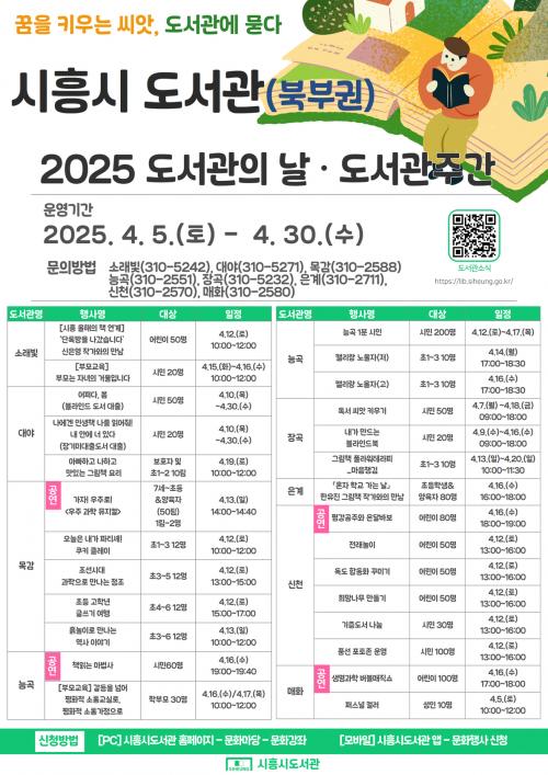 [½Åµ¿¾Æ¹æ¼Û ½ÃÈï½Ã=À̽ŵ¿±âÀÚ] ½ÃÈï½Ã ¼Ò·¡ºûµµ¼­°üÀ» ºñ·ÔÇÑ ºÏºÎ±Ç 8°³ °ø°øµµ¼­°üÀÌ ¡®µµ¼­°üÀÇ ³¯ ¹× µµ¼­°üÁÖ°£¡¯À» ¸Â¾Æ dz¼ºÇÑ µ¶¼­ Çà»ç¸¦ ¿î¿µÇÑ´Ù. 4¿ù 12ÀÏ ¡®Á¦3ȸ µµ¼­°üÀÇ ³¯¡¯°ú ¡®Á¦61ȸ µµ¼­°ü ÁÖ°£(4¿ù 12ÀÏ~18ÀÏ)¡¯À» ¸Â¾Æ, ´Ù¾çÇÑ Çà»ç¿Í Àü½Ã¡¦