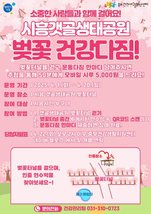 [½Åµ¿¾Æ¹æ¼Û ½ÃÈï½Ã=À̽ŵ¿±âÀÚ] ½ÃÈï½Ã´Â ¿À´Â 4¿ù 1ÀϺÎÅÍ 20ÀϱîÁö ¡®º¢²É °Ç°­´ÙÁü!¡¯ º½¸ÂÀÌ °È±â À̺¥Æ®¸¦ ½ÃÈï°¹°ñ»ýŰø¿ø¿¡¼­ ÁøÇàÇÑ´Ù. À̹ø Çà»ç´Â ½ÃÈï½Ã¹Î ´©±¸³ª Âü¿©ÇÒ ¼ö ÀÖÀ¸¸ç, º½À» ¸Â¾Æ º¢²É ¸í¼ÒÀÎ ½ÃÈï °¹°ñ»ýŰø¿ø¿¡¼­ Áñ°Å¿î °È±â Ȱµ¿°ú ¡¦