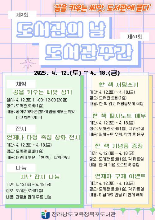 [½Åµ¿¾Æ¹æ¼Û Àü³²¸ñÆ÷=À̽ŵ¿±âÀÚ] Àü¶ó³²µµ±³À°Ã»¸ñÆ÷µµ¼­°üÀº Á¦3ȸ µµ¼­°üÀÇ ³¯ ¹× Á¦61ȸ µµ¼­°üÁÖ°£À» ¸Â¾Æ 4¿ù 12ÀϺÎÅÍ 4¿ù 18ÀϱîÁö 7°³ µ¶¼­¹®È­ Çà»ç¸¦ °³ÃÖÇÑ´Ù°í ¹àÇû´Ù. üÇè- µµ¼­°üÀÇ ³¯ÀÎ 4¿ù 12ÀÏ Åä¿äÀÏÀº ¡®²ÞÀ» Ű¿ì´Â ¾¾¾Ñ ½É±â¡¯¸¦ ÁøÇàÇÑ´Ù.¡¦