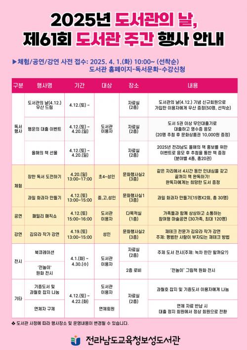 [½Åµ¿¾Æ¹æ¼Û Àü³²º¸¼º=À̽ŵ¿±âÀÚ] Àü¶ó³²µµ±³À°Ã»º¸¼ºµµ¼­°üÀº 2025³â µµ¼­°üÀÇ ³¯ ¹× µµ¼­°ü ÁÖ°£À» ¸ÂÀÌÇÏ¿© üÇè, °­¿¬, Àü½Ã, °ø¿¬ µî Áö¿ª¹ÎÀÌ Âü¿©ÇÒ ¼ö ÀÖ´Â ´Ù¾çÇÑ µ¶¼­Çà»ç¸¦ ¿î¿µÇÑ´Ù. üÇè Çà»ç·Î´Â °úÀÏ È­°úÀÚ ¸¸µé±â, °¡Á·ÀÌ ÇÔ²² Áñ±æ ¼ö ÀÖ´Â Âü¿©¡¦