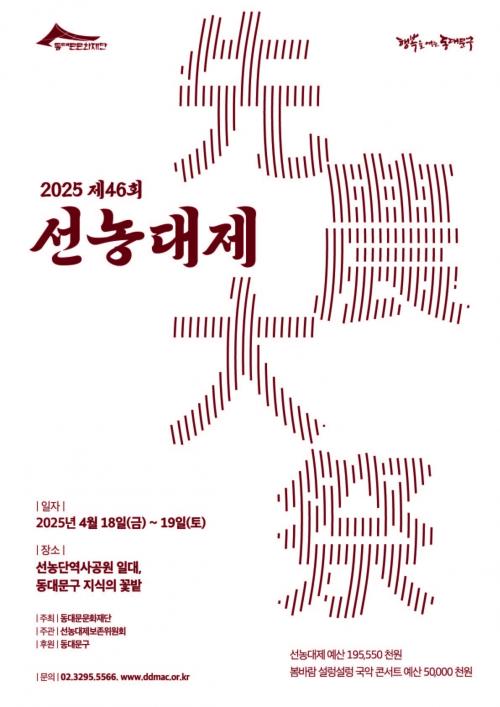 [½Åµ¿¾Æ¹æ¼Û µ¿´ë¹®±¸=À̽ŵ¿±âÀÚ] µ¿´ë¹®¹®È­Àç´ÜÀº ¿À´Â 4¿ù 18ÀÏ(±Ý)ºÎÅÍ 19ÀÏ(Åä)±îÁö ¡®¼±³ó´Ü¿ª»ç°ø¿ø(Á¦±âµ¿)¡¯ ¹× ¡®Áö½ÄÀÇ ²É¹ç(Àü³óµ¿)¡¯¿¡¼­ ÀüÅë°ú Çö´ë°¡ ¾î¿ì·¯Áø ¹®È­ÃàÁ¦ <Á¦46ȸ ¼±³ó´ëÁ¦>¸¦ °³ÃÖÇÑ´Ù°í 9ÀÏ ¹àÇû´Ù. ¼±³ó´ëÁ¦´Â °í·Á ‧ Á¶¼± ¡¦