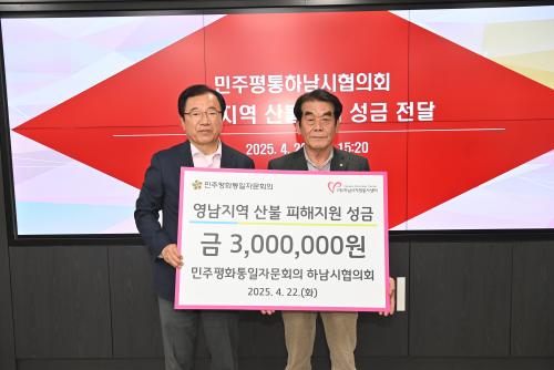 [½Åµ¿¾Æ¹æ¼Û Çϳ²½Ã=À̽ŵ¿±âÀÚ] ¹ÎÁÖÆòÈ­ÅëÀÏÀÚ¹®È¸ÀÇ Çϳ²½ÃÇùÀÇȸ´Â 22ÀÏ Çϳ²½ÃÀå½ÇÀ» ¹æ¹®ÇÏ¿© ¿µ³²Áö¿ª »êºÒ ÇÇÇØ ÀÌÀç¹ÎµéÀ» À§ÇØ ¼º±Ý »ï¹é¸¸¿øÀ» Àü´ÞÇß´Ù.     À̹ø ¼º±ÝÀº »çȸº¹Áö°øµ¿¸ð±Ýȸ¸¦ ÅëÇØ Àü¾× ¿µ³²Áö¿ª »êºÒ ÇÇÇØ ÀÌÀ硦