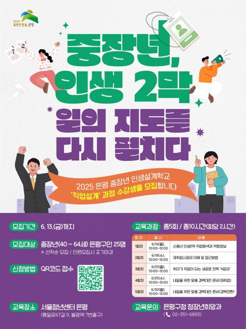 [½Åµ¿¾Æ¹æ¼Û ÀºÆò±¸=À̽ŵ¿±âÀÚ] ¼­¿ï ÀºÆò±¸´Â °¡Á·°ú »çȸ¸¦ À§ÇØ ¿­½ÉÈ÷ ´Þ·Á¿Â ÁßÀå³âÃþÀÇ »õ·Î¿î Áø·Î Ž»ö°ú »ý¾Ö ¼³°è Ư¼ºÈ­ ±³À° ÇÁ·Î±×·¥ÀÎ ¡®ÀºÆò ÁßÀå³â Àλý¼³°èÇб³¡¯¸¦ ¿î¿µÇÑ´Ù°í ¹àÇû´Ù. À̹ø ÁßÀå³â Àλý¼³°èÇб³´Â Àλý ÀüȯÁ¡À» ¸ÂÀÌÇÑ ÁßÀå³âÃþ¡¦