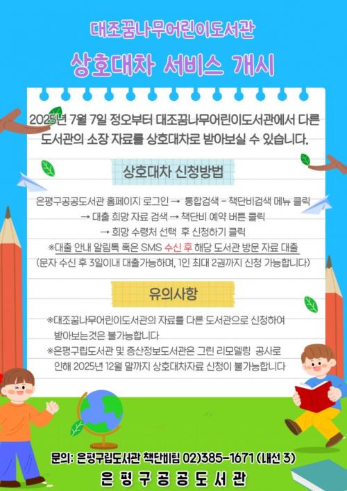[½Åµ¿¾Æ¹æ¼Û ÀºÆò±¸=À̽ŵ¿±âÀÚ] ¼­¿ï ÀºÆò±¸´Â ¿À´Â 7ÀϺÎÅÍ ±¸ °ø°øµµ¼­°üÀÇ »óÈ£´ëÂ÷ ¼­ºñ½º °¡´É µµ¼­°üÀ» ±âÁ¸ 10°÷¿¡¼­ ´ëÁ¶²Þ³ª¹«¾î¸°À̵µ¼­°üÀ» Ãß°¡ÇÑ 11°÷À¸·Î È®´ë ¿î¿µÇÑ´Ù°í ¹àÇû´Ù. »óÈ£´ëÂ÷ ¼­ºñ½º´Â °ü³» µµ¼­°ü °£ ÀڷḦ °øµ¿ Ȱ¿ëÇÒ ¼ö ÀÖµµ·Ï ¡¦