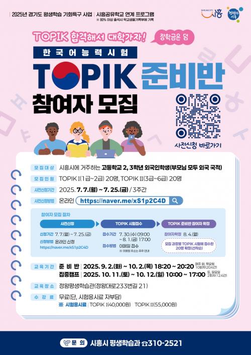 [½Åµ¿¾Æ¹æ¼Û ½ÃÈï½Ã=À̽ŵ¿±âÀÚ] ½ÃÈï½Ã´Â 2025³â °æ±âµµ Æò»ýÇнÀ ±âȸƯ±¸ »ç¾÷ÀÇ ÀÏȯÀ¸·Î, °ü³»¿¡ °ÅÁÖÇÏ´Â °íµîÇб³ 2~3Çг⠿ܱ¹ÀÎ ÇлýÀ» ´ë»óÀ¸·Î ¡®Çѱ¹¾î´É·Â½ÃÇè(TOPIK) Áغñ¹Ý¡¯À» ¿î¿µÇÑ´Ù. À̹ø °úÁ¤Àº ºÎ¸ð ¸ðµÎ ¿Ü±¹ ±¹ÀûÀÎ °íµîÇлýÀ» ´ë»óÀ¸·Î Çϸ硦