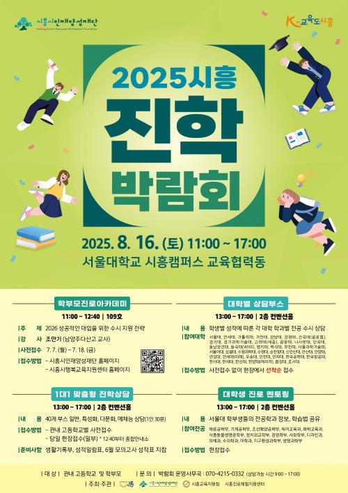 [½Åµ¿¾Æ¹æ¼Û ½ÃÈï½Ã=À̽ŵ¿±âÀÚ] ½ÃÈï½Ã´Â ½ÃÈï½ÃÀÎÀç¾ç¼ºÀç´ÜÀÌ ½Ã ±³À°ÀÚÄ¡°ú, ½ÃÈïÁø·ÎüÇèÁö¿ø¼¾ÅÍ, ½ÃÈï±³À°Áö¿øÃ»°ú °øµ¿ ÁÖ°üÀ¸·Î ¿À´Â 8¿ù 16ÀÏ ¿ÀÀü 11½ÃºÎÅÍ ¿ÀÈÄ 5½Ã±îÁö ¼­¿ï´ëÇб³ ½ÃÈïÄ·ÆÛ½º ±³À°Çù·Âµ¿¿¡¼­ ¡®2025³â ½ÃÈï ÁøÇÐ ¹Ú¶÷ȸ¡¯¸¦ °³ÃÖÇÑ´Ù°í 9ÀÏ¡¦