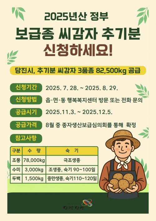 [½Åµ¿¾Æ¹æ¼Û=´çÁø½Ã³ó¾÷±â¼ú¼¾ÅÍ(¼ÒÀå ±è¼®±¤)´Â ³ó¹ÎµéÀÇ ¼Òµæ Áõ°¡¿Í ¾ÈÁ¤ÀûÀÎ °¨ÀÚ »ý»ê ±â¹Ý ¸¶·ÃÀ» À§ÇØ 8¿ù 29ÀϱîÁö 2025³â»ê Á¤ºÎ º¸±ÞÁ¾ ¾¾°¨ÀÚ Ãß±âºÐ ½ÅûÀ» ¹Þ´Â´Ù°í 1ÀÏ ¹àÇû´Ù. À̹ø¿¡ °ø±ÞµÇ´Â ¾¾°¨ÀÚ´Â °­¿øµµ°¨ÀÚÁ¾ÀÚÁøÈï¿ø¿¡¼­ »ý»êµÈ ¿ì·® ¾¾°¨ÀÚ¡¦