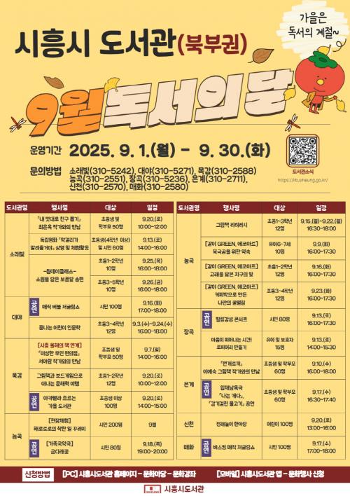 [½Åµ¿¾Æ¹æ¼Û ½ÃÈï½Ã=À̽ŵ¿±âÀÚ] ½ÃÈï½Ã ¼Ò·¡ºûµµ¼­°üÀ» ºñ·ÔÇÑ ºÏºÎ±Ç 8°³ °ø°øµµ¼­°üÀÌ ¡®9¿ù µ¶¼­ÀÇ ´Þ¡¯À» ¸Â¾Æ 9¿ù ÇÑ ´Þ°£ ½Ã¹ÎÀÇ µ¶¼­¹®È­ ȯ°æÀ» Á¶¼ºÇÏ´Â 20°³ÀÇ ¹®È­Çà»ç¸¦ ¿î¿µÇÑ´Ù. À̹ø Çà»ç´Â ÀÛ°¡¿ÍÀÇ ¸¸³², °ø¿¬, ¹®È­¿¹¼ú üÇè, µ¶¼­ ÇÁ·Î±×·¥ µîÀ¸¡¦