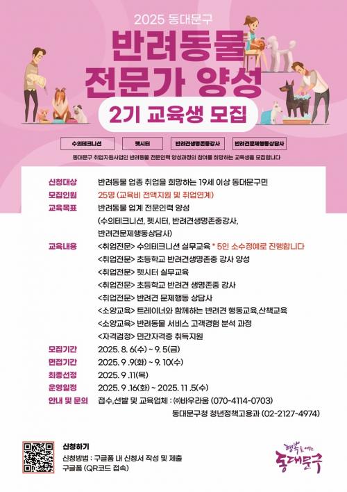 [½Åµ¿¾Æ¹æ¼Û µ¿´ë¹®±¸=À̽ŵ¿±âÀÚ] ¼­¿ï µ¿´ë¹®±¸´Â ¹Ý·Áµ¿¹° »ê¾÷¿¡ °ü½É ÀÖ´Â ±¸¹ÎÀÇ Ãë¾÷ ¿ª·®À» °­È­Çϰí Àü¹®Àη ¾ç¼ºÀ» Áö¿øÇϱâ À§ÇØ ¡®2025 µ¿´ë¹®±¸ ¹Ý·Áµ¿¹° Àü¹®°¡ ¾ç¼º 2±â¡¯ ±³À°»ýÀ» ¸ðÁýÇÑ´Ù. ¸ðÁý ´ë»óÀº ¹Ý·Áµ¿¹° °ü·Ã ¾÷Á¾À¸·ÎÀÇ Ãë¾÷À» Èñ¸ÁÇϴ¡¦