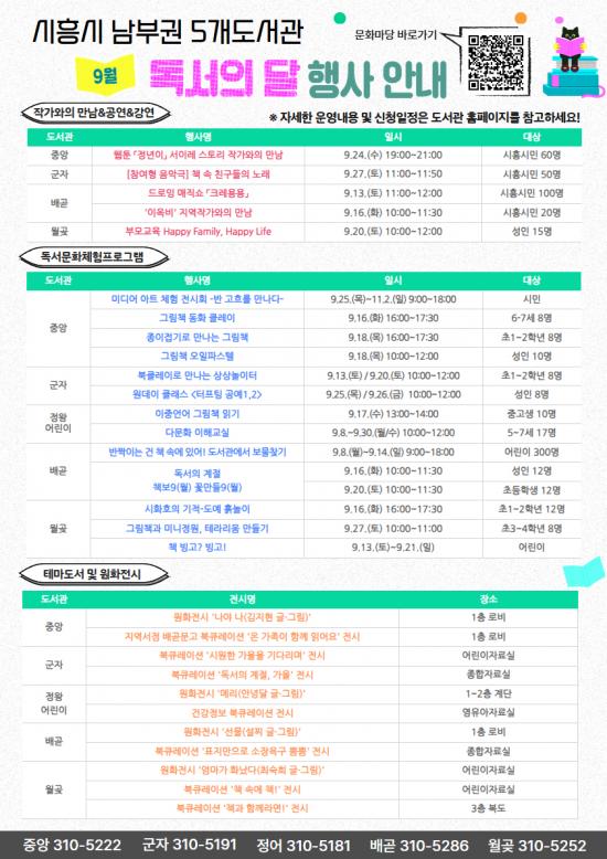 [½Åµ¿¾Æ¹æ¼Û ½ÃÈï½Ã=À̽ŵ¿±âÀÚ] ½ÃÈï½Ã´Â 9¿ù ¡®µ¶¼­ÀÇ ´Þ¡¯À» ¸Â¾Æ ³²ºÎ±Ç 5°³ µµ¼­°ü¿¡¼­ Ã¥°ú ÇÔ²² Áñ±æ ¼ö ÀÖ´Â °ø¿¬, Àü½Ã, üÇè ÇÁ·Î±×·¥ µî ´Ùä·Î¿î ¹®È­Çà»ç¸¦ ¿î¿µÇÑ´Ù. À̹ø Çà»ç´Â ½Ã¹Î ´©±¸³ª Ã¥°ú ÀÚ¿¬½º·´°Ô °¡±î¿öÁú ¼ö ÀÖµµ·Ï ¸¶·ÃµÆ´Ù. ÁÖ¿ä ÇÁ·Î¡¦