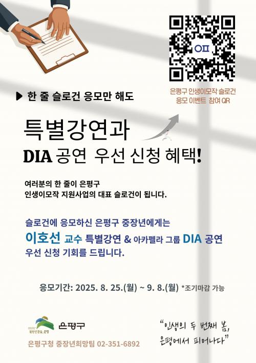 [½Åµ¿¾Æ¹æ¼Û ÀºÆò±¸=À̽ŵ¿±âÀÚ] ¼­¿ï ÀºÆò±¸´Â ¿À´Â 25ÀϺÎÅÍ ³»´Þ 8ÀϱîÁö ÁßÀå³âÃþÀ» ´ë»óÀ¸·Î ¡®ÀλýÀ̸ðÀÛ ½½·Î°Ç ÀÀ¸ð À̺¥Æ®¡¯¸¦ ÁøÇàÇÑ´Ù°í ¹àÇû´Ù. À̹ø À̺¥Æ®´Â ÀλýÀ̸ðÀÛ Áö¿ø»ç¾÷ÀÇ ºñÀü°ú °¡Ä¡¸¦ ´ã¾Æ³¾ ´ëÇ¥ Ç¥¾î¸¦ ¹ß±¼Çϰí, ±¸¹Î Âü¿©¸¦ Ȱ¼ºÈ­Çϱ⡦