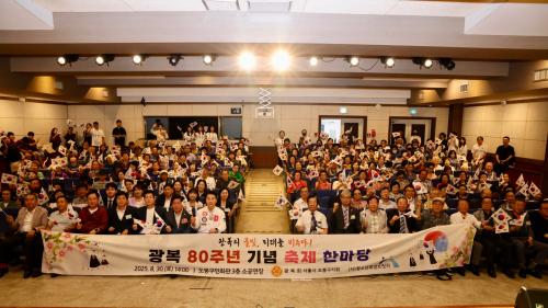 [½Åµ¿¾Æ¹æ¼Û µµºÀ±¸=À̽ŵ¿±âÀÚ] ¼­¿ï µµºÀ±¸°¡ Áö³­ 8¿ù 30ÀÏ µµºÀ±¸¹Îȸ°ü 3Ãþ ¼Ò°ø¿¬Àå¿¡¼­ ¿­¸° ±¤º¹ 80Áֳ⠱â³ä ¡®±¤º¹ÀÇ ºÒºû, ¹Ì·¡¸¦ ºñÃß´Ù¡¯ Çà»ç°¡ ¼ºÈ²¸®¿¡ ¸·À» ³»·È´Ù°í ¹àÇû´Ù. ±¤º¹È¸ µµºÀ±¸Áöȸ°¡ ÁÖ°üÇÑ À̹ø Çà»ç´Â ±¤º¹ÀÇ °¡Ä¡¸¦ ±â¸®°í ¹Ì·¡¼¼´ë¡¦