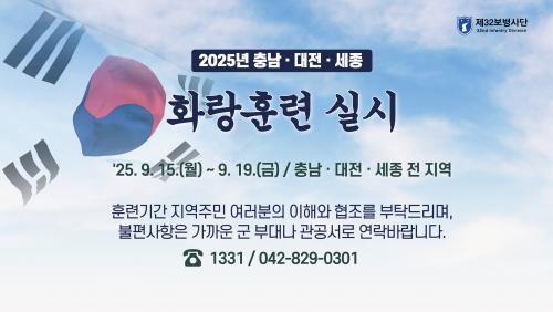 [½Åµ¿¾Æ¹æ¼Û=ÀÌÀçö±âÀÚ] ◦À°±º Á¦32º¸º´»ç´ÜÀº, ¿À´Â 9¿ù 15ÀÏ(¿ù)ºÎÅÍ 9¿ù 19ÀÏ(±Ý)±îÁö Ãæ³²¤ý´ëÀü¤ý¼¼Á¾ Áö¿ª¿¡¼­ È­¶ûÈÆ·ÃÀ» ½Ç½ÃÇÑ´Ù°í ¹àÇû´Ù. ◦È­¶ûÈÆ·ÃÀº ¹Î¡¤°ü¡¤±º¡¤°æ¡¤¼Ò¹æÀÌ ÅëÇÕÇÏ¿© Àü¡¤Æò½Ã ÈĹæÁö¿ª ÅëÇÕ¹æÀ§ÀÛÀü¿¡ ´ëÇÑ ½ÃÇà ÀýÂ÷¸¦¡¦