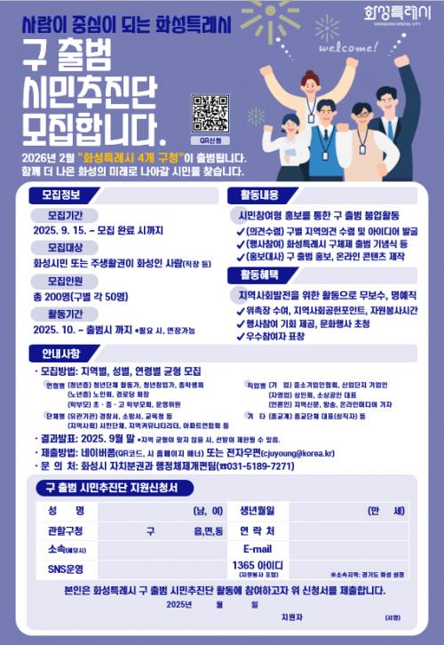 [½Åµ¿¾Æ¹æ¼Û=ÀÌÀçö±âÀÚ] È­¼ºÆ¯·Ê½Ã(½ÃÀå Á¤¸í±Ù)´Â 2026³â 2¿ù 1ÀÏ 4°³ ÀϹݱ¸ Ãâ¹üÀ» ¾ÕµÎ°í ½Ã¹Î°ú ÇÔ²²ÇÏ´Â Âü¿©Çü ÇàÁ¤ ±¸ÇöÀ» À§ÇØ ¡®±¸ Ãâ¹ü ½Ã¹ÎÃßÁø´Ü¡¯À» °ø°³ ¸ðÁýÇÑ´Ù°í 19ÀÏ ¹àÇû´Ù. À̹ø ¸ðÁýÀº ½Ã¹Î ½º½º·Î°¡ ÇàÁ¤Ã¼Á¦ °³ÆíÀÇ ÁÖü°¡ µÅ Âü¿©Çϸ鼭 ¡¦