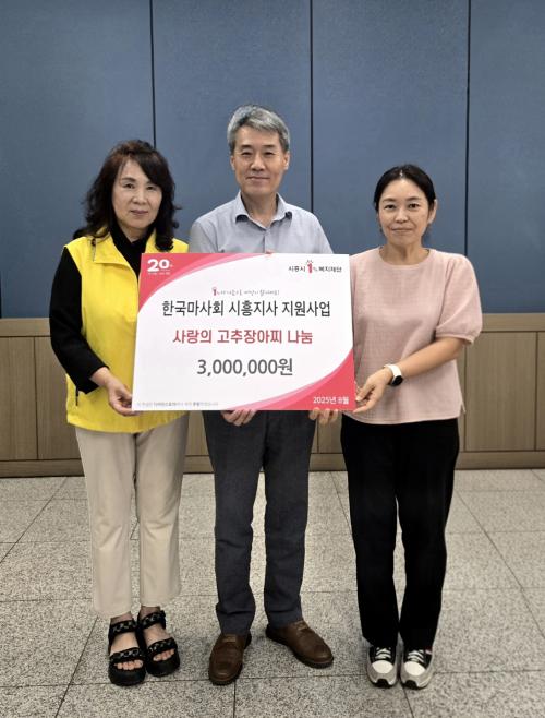 [½Åµ¿¾Æ¹æ¼Û ½ÃÈï½Ã=À̽ŵ¿±âÀÚ] ½ÃÈï½Ã Á¤¿Õº»µ¿ Áö¿ª»çȸº¸ÀåÇùÀÇü´Â Áö³­ 9¿ù 18ÀÏ, Çѱ¹¸¶»çȸ ½ÃÈïÁö»çÀÇ ±âºÎ±Ý Áö¿ø °ø¸ð¸¦ ÅëÇØ ¡®»ç¶ûÀÇ °íÃßÀ徯Âî Áö¿ø»ç¾÷¡¯À» ÃßÁøÇß´Ù. À̹ø »ç¾÷Àº ÃÑ 3¹é¸¸ ¿øÀÇ °ø¸ð»ç¾÷ºñ·Î ÁøÇàµÆÀ¸¸ç, Á¤¼º²¯ ´ã±Ù °íÃßÀ徯Âî¿Í¡¦