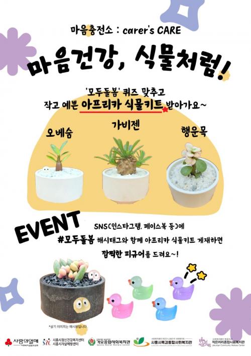 [½Åµ¿¾Æ¹æ¼Û ½ÃÈï½Ã=À̽ŵ¿±âÀÚ] ½ÃÈï½ÃÁ¤½Å°Ç°­º¹Áö¼¾ÅÍ´Â °øµ¿¸ð±Ýȸ »ç¶ûÀÇ ¿­¸Å ¹èºÐ»ç¾÷ ¡®¸¶À½ÃæÀü¼Ò¡¯ÀÇ ÀÏȯÀ¸·Î, 9¿ù 26ÀϺÎÅÍ 28ÀϱîÁö ¿­¸®´Â ½ÃÈï°¹°ñÃàÁ¦¿¡ ¡®¸¶À½°Ç°­, ½Ä¹°Ã³·³¡¯À» ÁÖÁ¦·Î ÇÑ Á¤½Å°Ç°­ È«º¸ºÎ½º¸¦ ¿î¿µÇÑ´Ù. ¡®¸¶À½°Ç°­, ½Ä¹°Ã³·³¡¯ÀÌ¡¦
