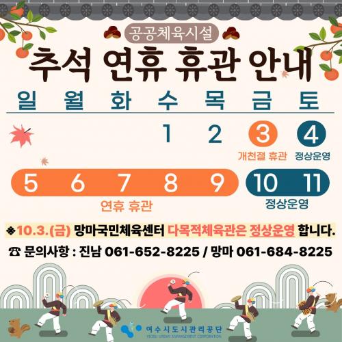 [½Åµ¿¾Æ¹æ¼Û ¿©¼ö=±è±â³² ±âÀÚ] ¿©¼ö½Ãµµ½Ã°ü¸®°ø´Ü(ÀÌ»çÀå ¼Ûº´±¸)Àº ´ë¸íÀý Ãß¼® ¿¬ÈÞ ±â°£(10¿ù 5ÀÏ~10¿ù 9ÀÏ) µ¿¾È °ø´ÜÀÌ ¿î¿µ ÁßÀÎ °ø°ø üÀ°½Ã¼³À» ÈÞ°üÇÑ´Ù°í ¹àÇû´Ù. ÈÞ°ü ´ë»óÀº ¡âÁø³²¼ö¿µÀå ¡â¸Á¸¶±¹¹ÎüÀ°¼¾ÅÍ ¡âÀå¾ÖÀα¹¹ÎüÀ°¼¾ÅÍÀ̸ç, Á¤»ó ¿î¿µÀº¡¦