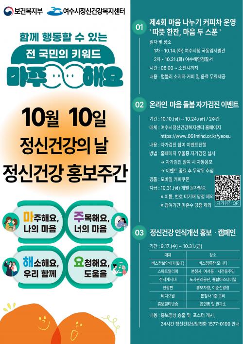 [½Åµ¿¾Æ¹æ¼Û ¿©¼ö=±è±â³² ±âÀÚ] ¿©¼ö½Ã(½ÃÀå Á¤±â¸í)´Â Á¤½Å°Ç°­ÀÇ ³¯(10¿ù 10ÀÏ)À» ±â³äÇØ 10¿ù 10ÀϺÎÅÍ 24ÀϱîÁö ¡®2025³â Á¤½Å°Ç°­ È«º¸ÁÖ°£¡¯À» ¿î¿µÇÑ´Ù. À̹ø È«º¸ÁÖ°£Àº ¡®¸¶ÁÖÇØ¿ä: Á¤½Å°Ç°­Àº ¸¶ÁÖÇϸ鼭 ½ÃÀÛÇÕ´Ï´Ù¡¯¸¦ ½½·Î°ÇÀ¸·Î, ½Ã¹ÎÀÇ Á¤½Å°Ç°­ ÁõÁø¡¦