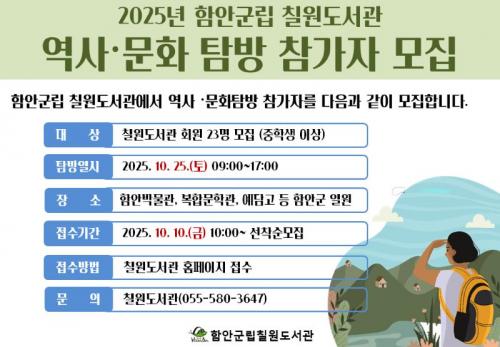 [½Åµ¿¾Æ¹æ¼Û °æ³²ÇÔ¾È=À̽ŵ¿±âÀÚ] ÇԾȱº¸³ Ä¥¿øµµ¼­°üÀÌ '2025³â ÇϹݱ⠿ª»ç¡¤¹®È­Å½¹æ' ÇÁ·Î±×·¥ Âü°¡ÀÚ¸¦ ¸ðÁýÇÑ´Ù. À̹ø ޹æÀº 10¿ù 25ÀÏ Åä¿äÀÏ ¿ÀÀü 10½Ã Ä¥¿øµµ¼­°ü¿¡¼­ Ãâ¹ßÇϸç, ¿¹´ã°í, ÇԾȺ¹ÇÕ¹®Çаü, ÇԾȹڹ°°ü, ¸»ÀÌ»ê°íºÐ±º µî ÇÔ¾È Áö¿ªÀÇ ´ëÇ¥¡¦