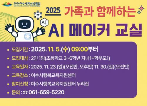 [½Åµ¿¾Æ¹æ¼Û ¿©¼ö=±è±â³² ±âÀÚ] ¿©¼ö½Ã(½ÃÀå Á¤±â¸í)´Â °ü³» ÃʵîÇб³ 3~6Çгâ Çлý°ú Çкθ𰡠ÇÔ²² Âü¿©ÇÏ´Â ¡®2025³â °¡Á·°ú ÇÔ²²ÇÏ´Â AI ¸ÞÀÌÄ¿ ±³½Ç¡¯ Âü¿©ÀÚ¸¦ 11¿ù 5ÀϺÎÅÍ ¸ðÁýÇÑ´Ù. À̹ø ÇÁ·Î±×·¥Àº ºÎ¸ð¿Í Àڳడ ÇÔ²² AI ±â¹Ý µµ±¸¸¦ Ȱ¿ëÇÑ Ã¢ÀÛ È°µ¿À» ¡¦