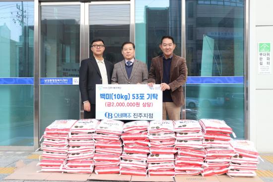 [½Åµ¿¾Æ¹æ¼Û °æ³²ÁøÁÖ=³²±Ã¿µ±â±âÀÚ] ¢ß¿Àºñ¸ÆÁÖ ÁøÁÖÁöÁ¡Àº 25ÀÏ, Áö¿ª»çȸ ¼Ò¿ÜµÈ ÀÌ¿ô¿¡°Ô Àü´ÞÇØ ´Þ¶ó¸ç ÁøÁֽú¹ÁöÀç´ÜÀ» ¹æ¹®ÇØ ¹é¹Ì 10kg 53Æ÷(ȯ°¡¾× ¾à 200¸¸ ¿ø »ó´ç)¸¦ ±âŹÇß´Ù. À̹ø ±âŹÀº ¢ß¿Àºñ¸ÆÁÖ ÁøÁÖÁöÁ¡ÀÇ Áö¼ÓÀûÀÎ »çȸ°øÇå Ȱµ¿ÀÇ ÀÏȯÀ¸·Î ÀÌ¡¦