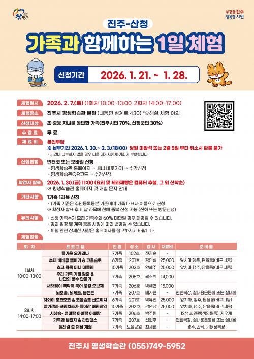 [½Åµ¿¾Æ¹æ¼Û °æ³²ÁøÁÖ=³²±Ã¿µ±â±âÀÚ] ÁøÁֽà Æò»ýÇнÀ°üÀº¡®ÁøÁÖ-»êû °¡Á·°ú ÇÔ²²ÇÏ´Â 1ÀÏ Ã¼Ç衯ÇÁ·Î±×·¥ Âü°¡ÀÚ¸¦ 1¿ù 21ºÎÅÍ 28ÀϱîÁö 8Àϰ£ ¸ðÁýÇÑ´Ù. 1ÀÏ Ã¼Çè ÇÁ·Î±×·¥Àº ÁøÁÖ½Ã¿Í »êû±ºÀÇ »ó»ý¹ßÀüÀ» À§ÇÑ °øµ¿»ç¾÷ÀÇ Çϳª·Î, »óÈ£ ±³·ù¿Í Çù·ÂÀ» ÅëÇØ Áö¡¦