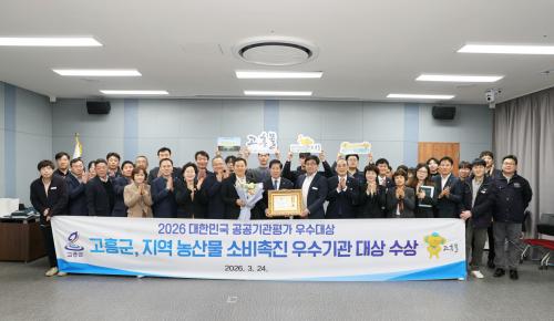 [½Åµ¿¾Æ¹æ¼Û Àü³²°íÈï=¹Ú±¤¿Á±âÀÚ] °íÈﱺ(±º¼ö °ø¿µ¹Î)Àº Áö³­ 24ÀÏ ±¹È¸ÀÇ¿øÈ¸°ü ´ëȸÀǽǿ¡¼­ ¿­¸° ¡®2026³â ´ëÇѹα¹ °ø°ø±â°üÆò°¡ ½Ã»ó½Ä¡¯¿¡¼­ Áö¿ª ³ó»ê¹° ¼Òºñ ÃËÁø ¿ì¼ö±â°üÀ¸·Î ¼±Á¤µÅ ¿ì¼ö´ë»óÀ» ¼ö»óÇß´Ù°í ¹àÇû´Ù. À̹ø ¼ö»óÀº ´ëÇѹα¹ ±¹È¸ °ø°ø±â°üÆò¡¦